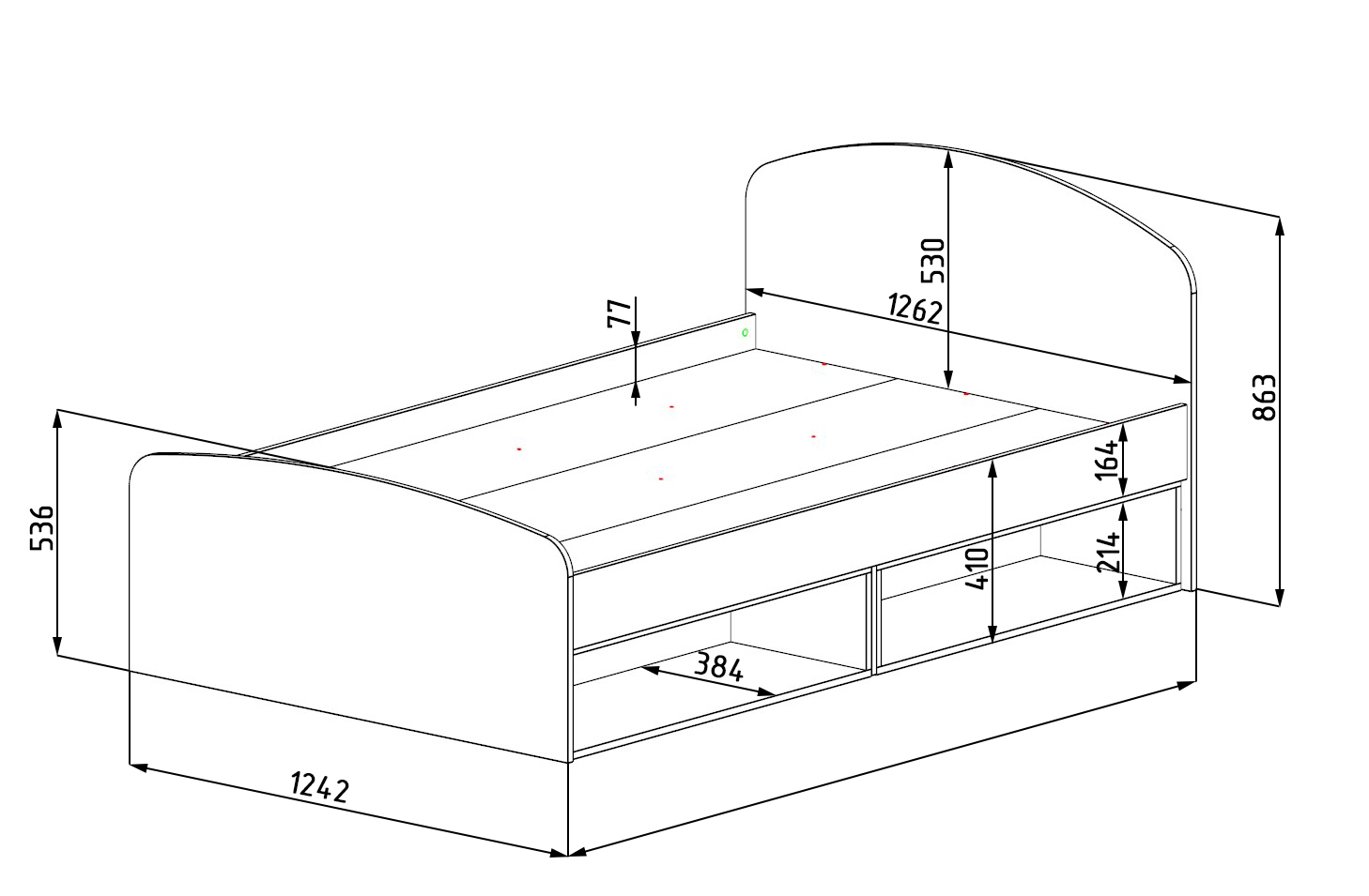 Габариты кровати: ширина 2036 х высота 863 х глубина 1262 мм