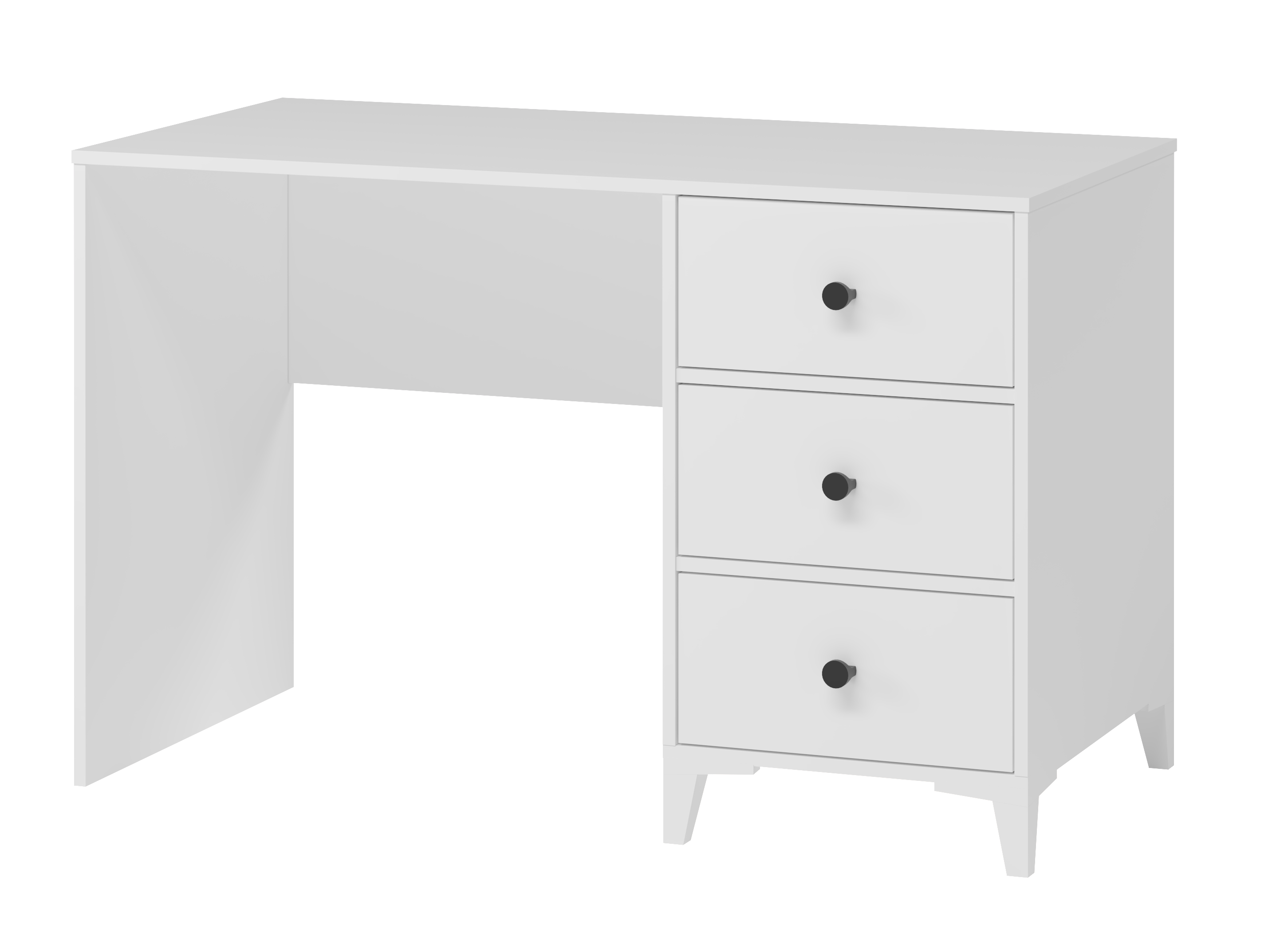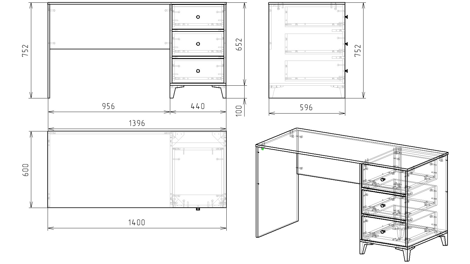В стол встроены три выдвижных ящика на направляющих скрытого монтажа с доводчиками.