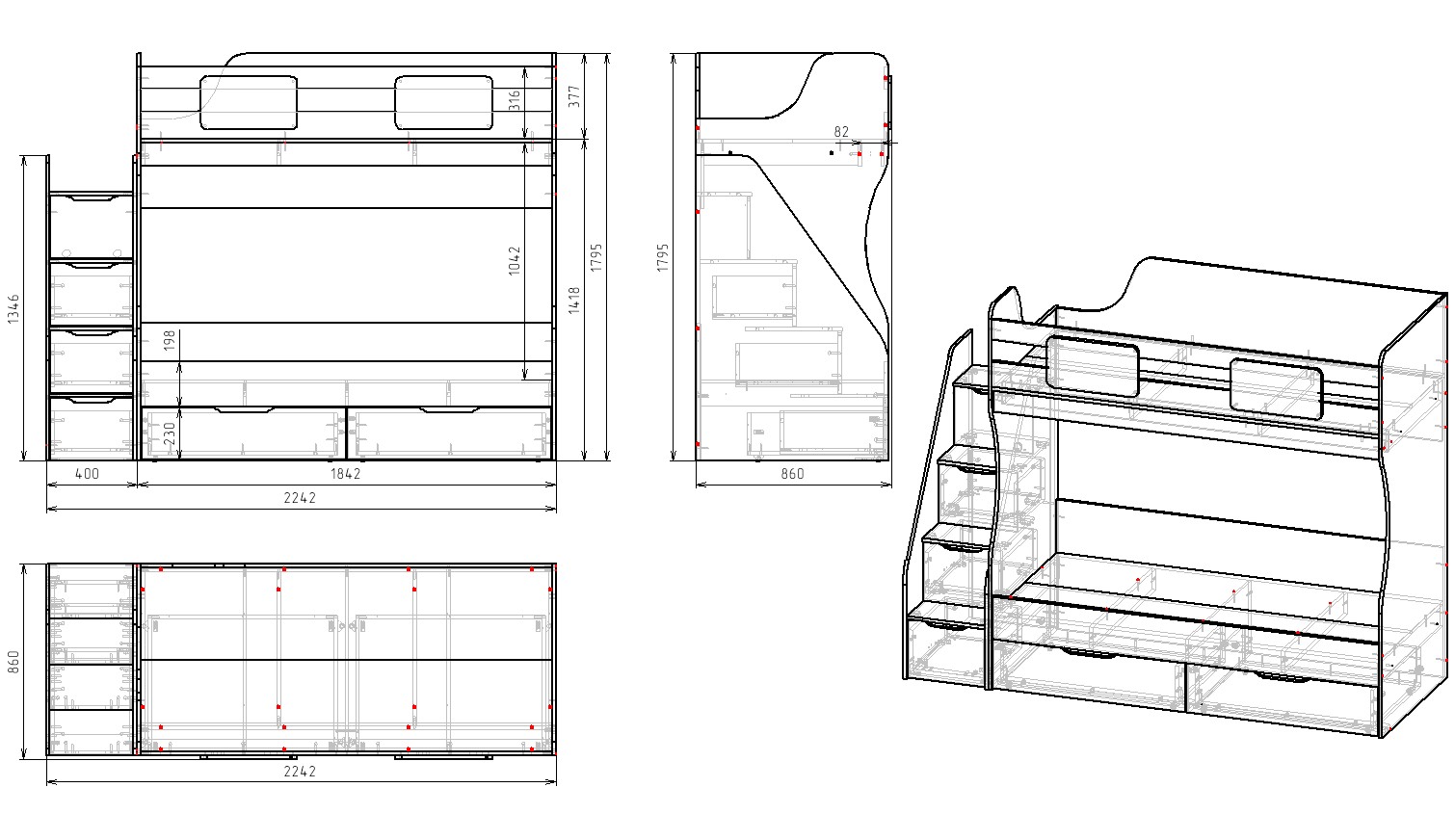 ширина 2243, высота 1795, глубина 861 мм