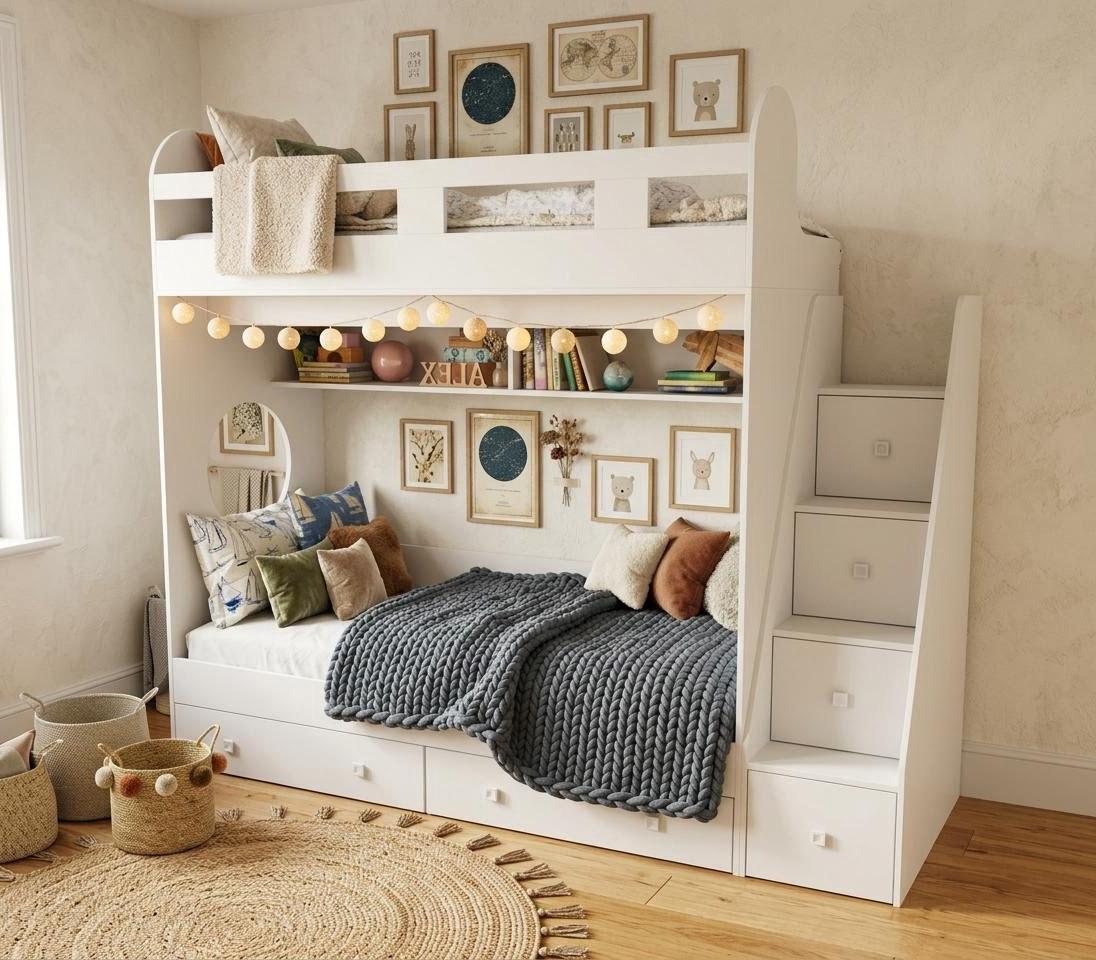 спальное место для двоих, навесная полка для книг и игрушек, вместительные выдвижные ящики под кроватью, а также безопасная лестница, обеспечивающая быстрый и удобный доступ на второй этаж.