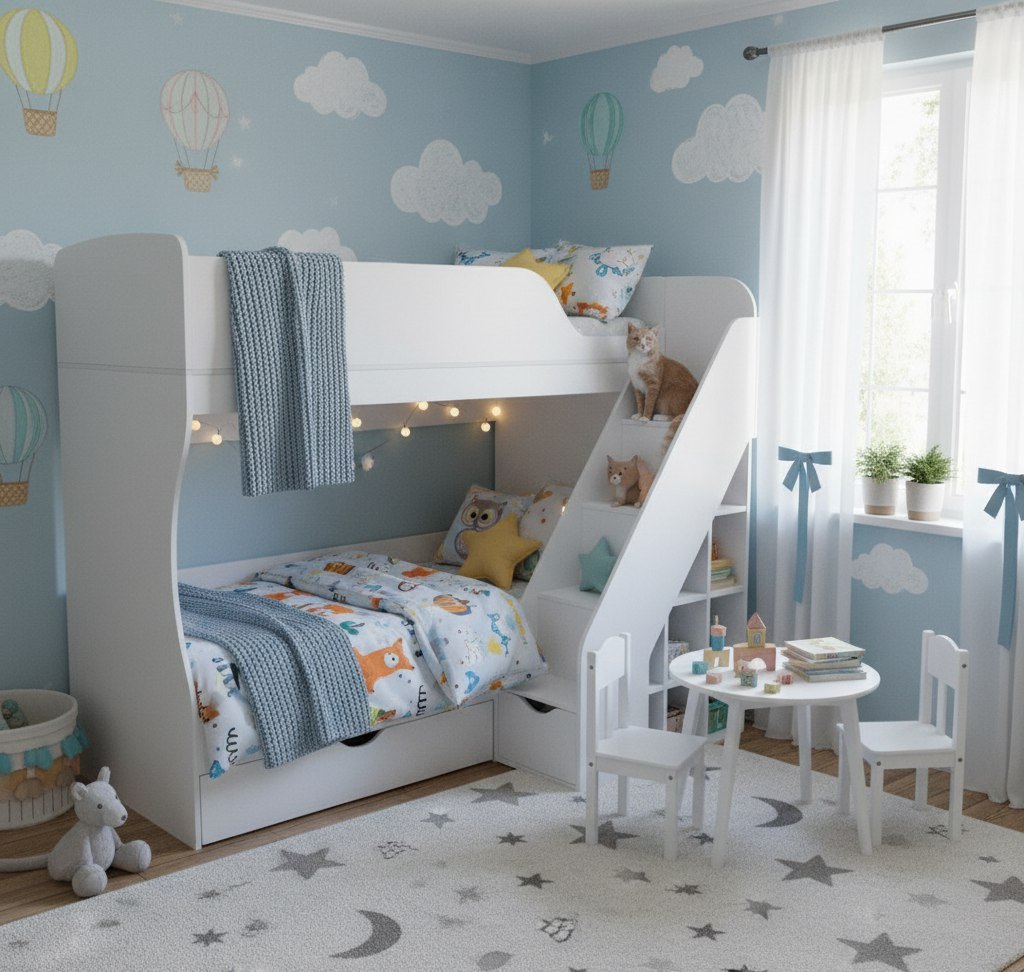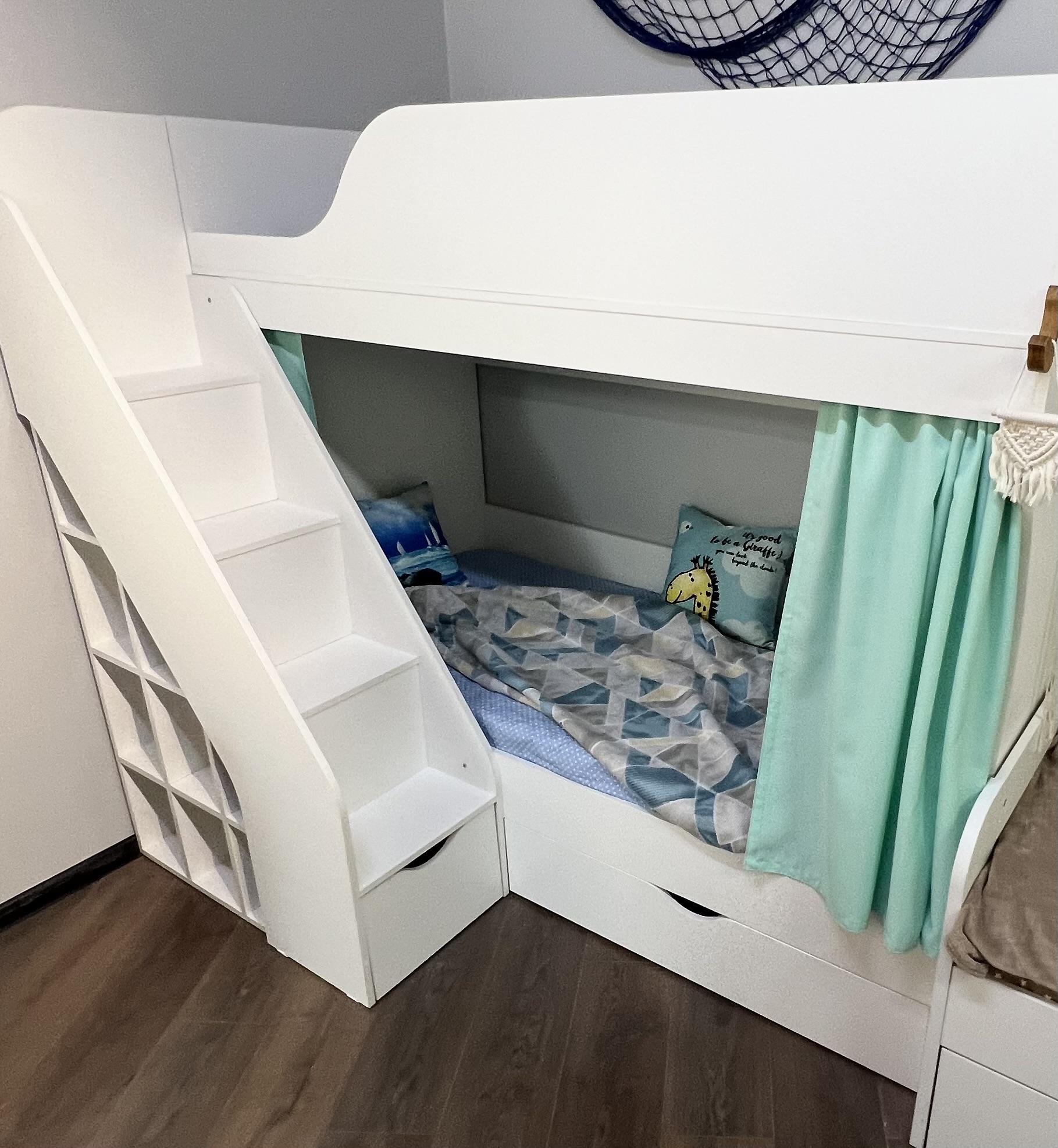 В нижнюю кровать встроен выдвижной ящик для белья и игрушек.