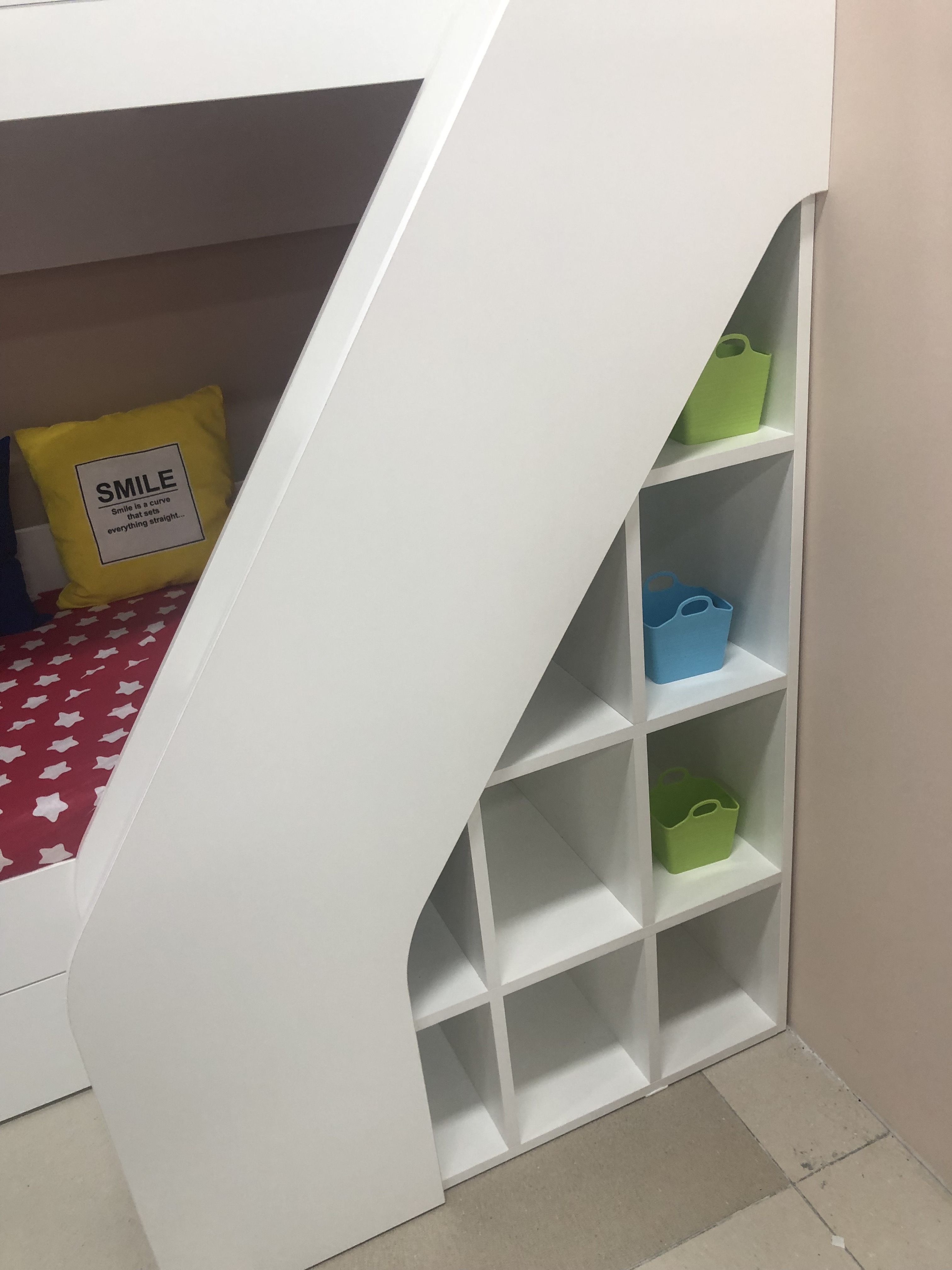 В нижней части лестницы имеется ящик для игрушек.