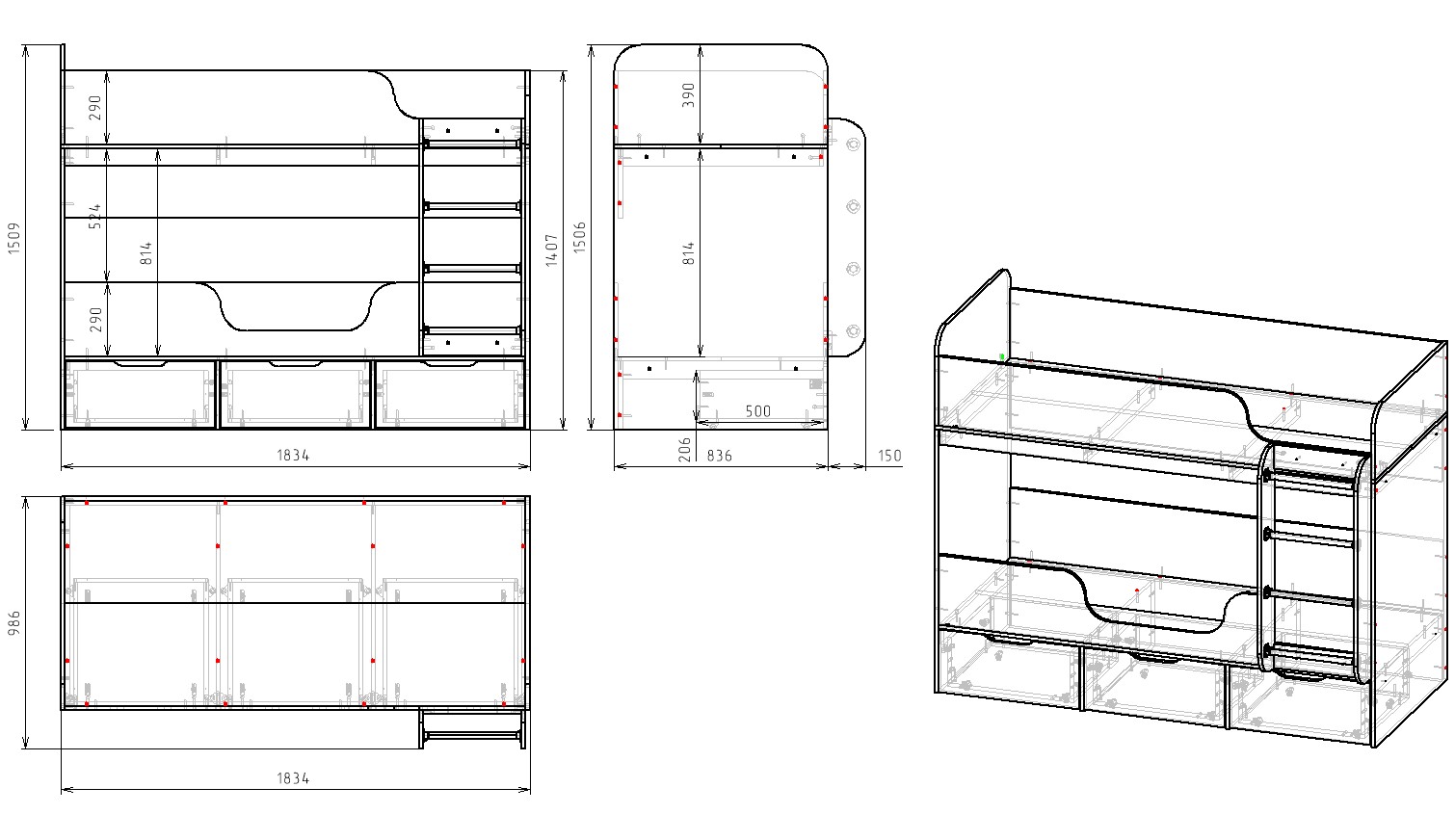 ширина 1834 х высота 1509 х глубина с учетом лестницы 986 мм
