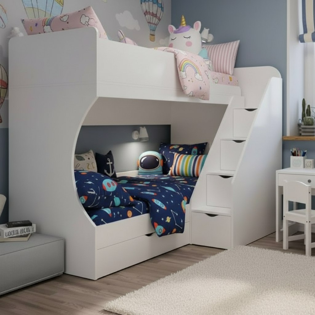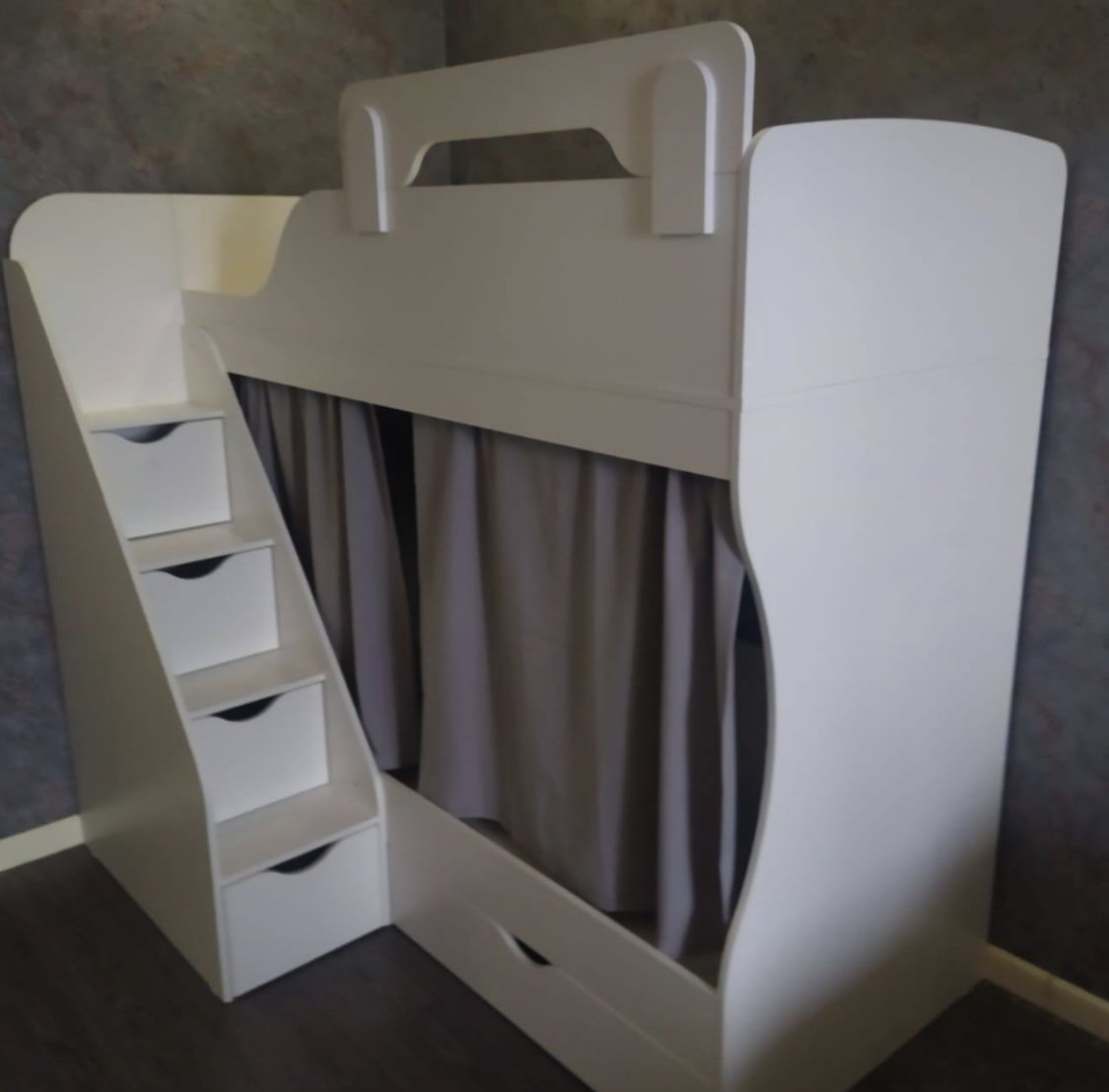Преимущества данной модели - удобная, безопасная лестница с ящиками для игрушек и комфортная высота кровати.