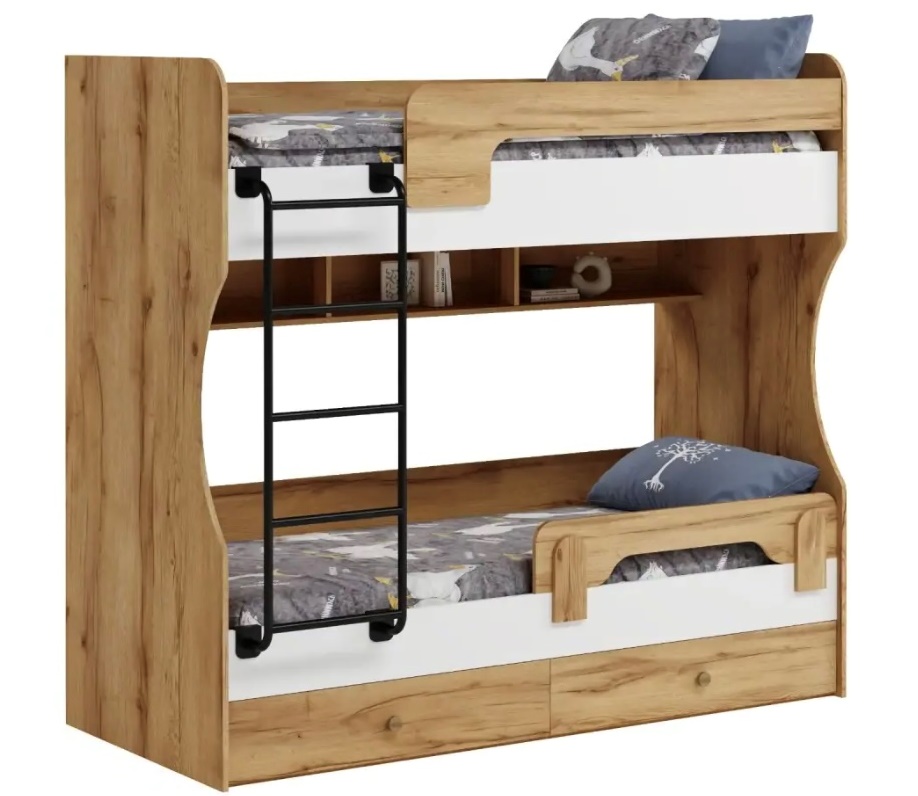 Двухъярусная кровать в декоре под дерево идеальна для любых интерьеров.