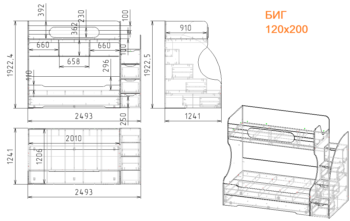 Габариты кровати: ширина с учетом лестницы 2493, глубина 1241, высота 1922 мм