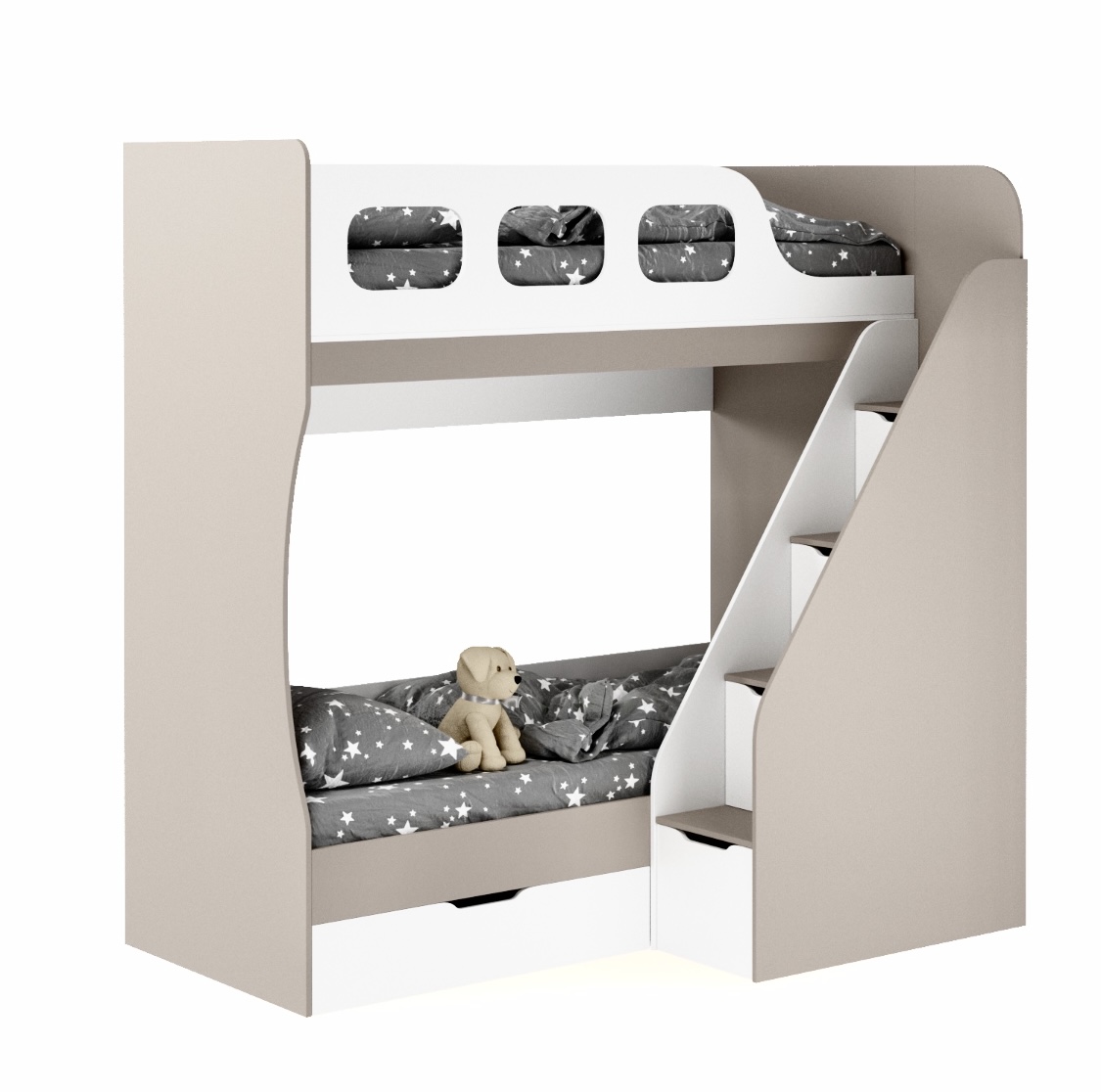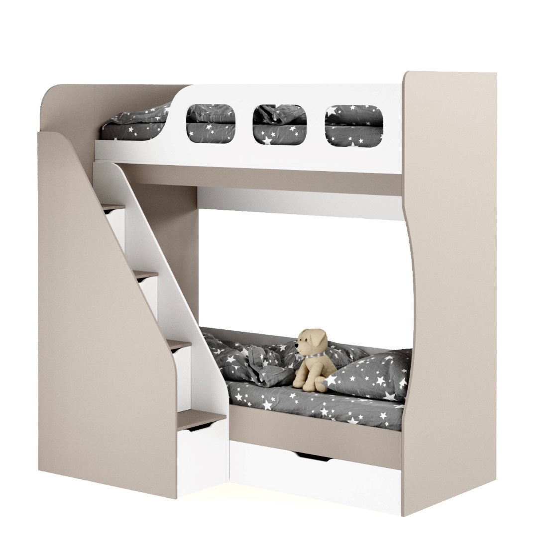 Высокая нагрузка на спальные места. Удобная лестница с ящиками. Высокий безопасный борт |