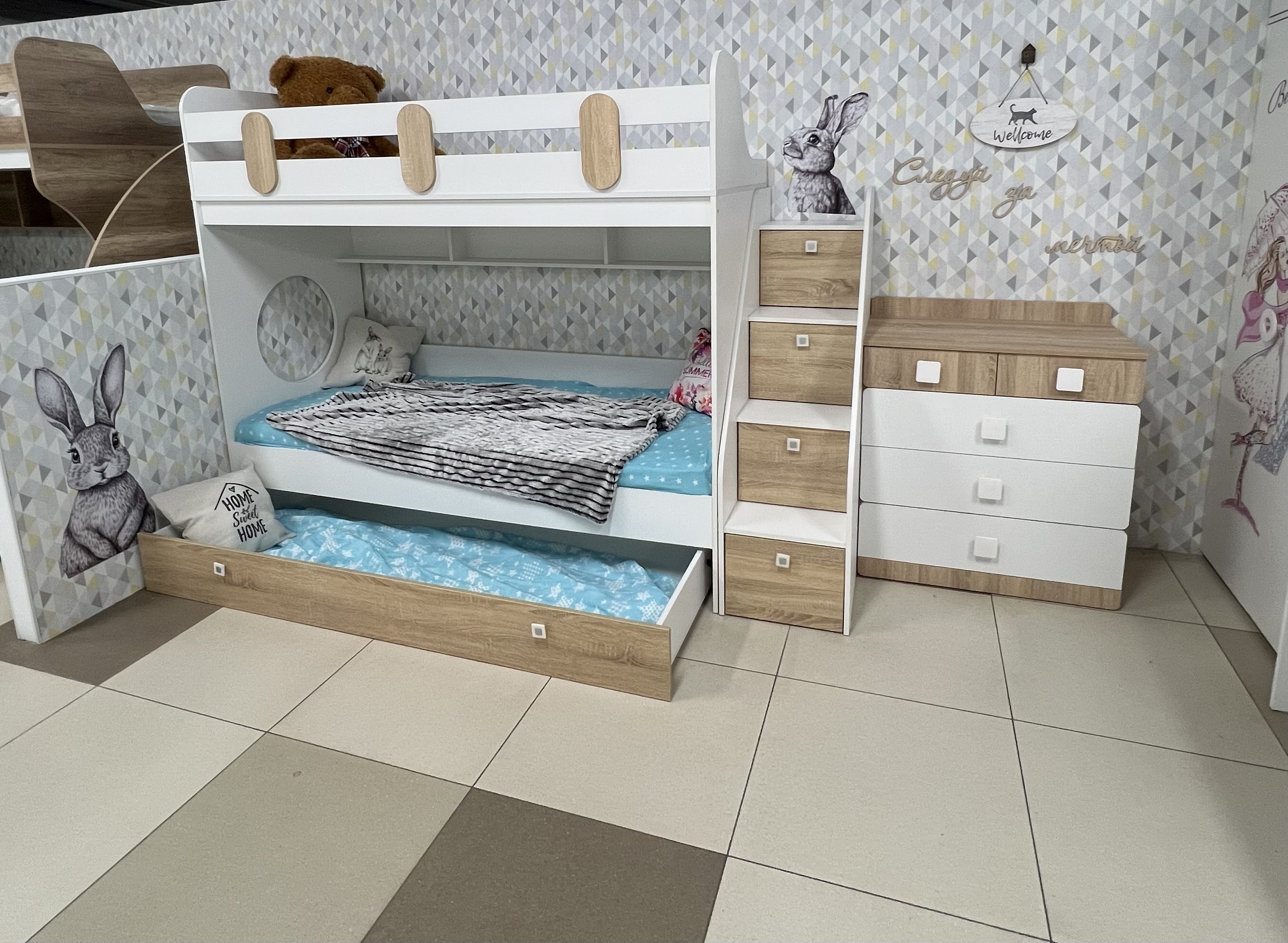Нижний ящик можно использовать как дополнительное выкатное спальное место (дно для этого специально укреплено)