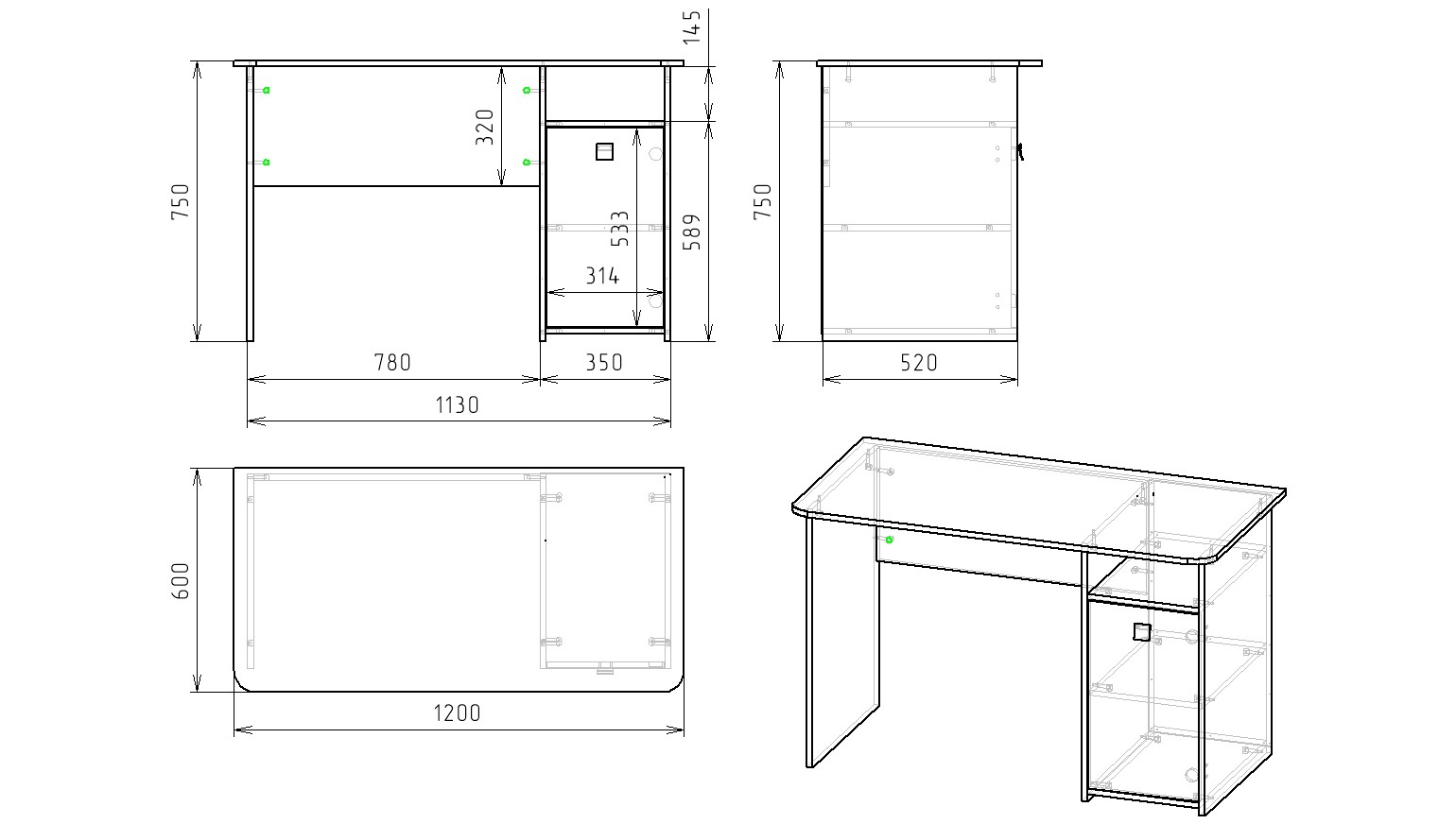 Габариты: ширина 1200, глубина 600, высота 750 мм