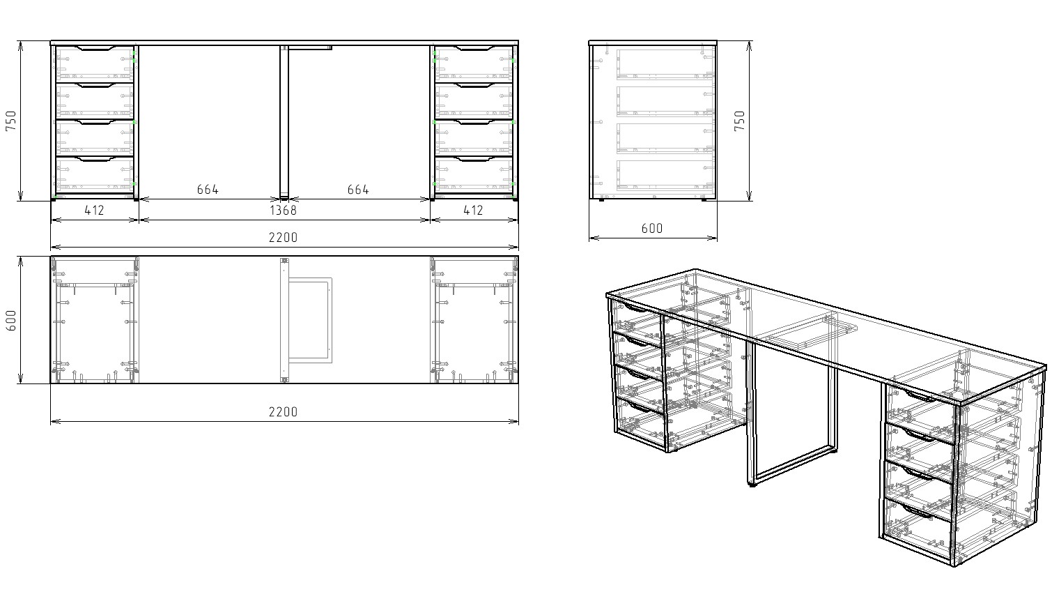 Габариты стола: ширина 2200 х высота 750 х глубина 600 мм