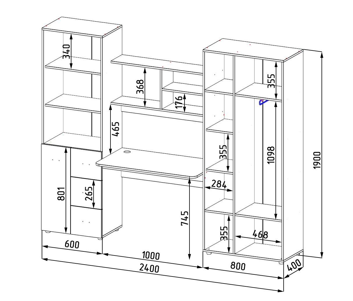 Габариты: ширина 2400, глубина 400, высота 1900 мм
