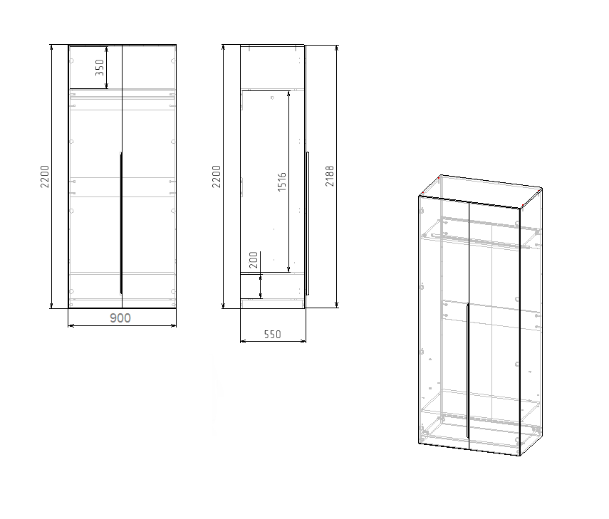 ЛДСП Е0,5. Толщина 16 мм. Доступна в цветах: корпус белый + фасады графит, корпус белый + фасады дуб золотистый, корпус дуб золотистый + фасады графит, полностью белый или полностью велюр |