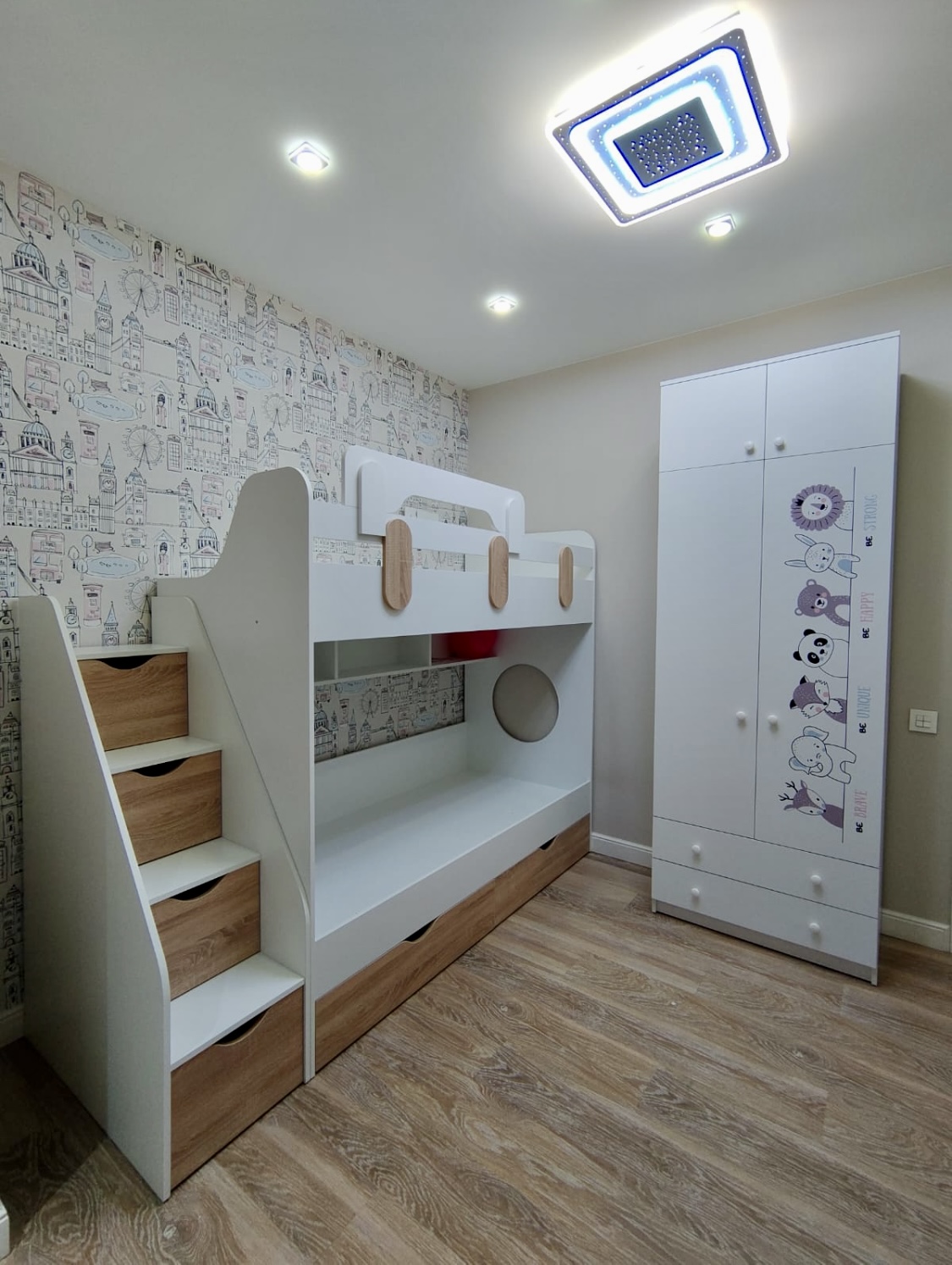 В лестницу встроены удобные ящики для хранения.