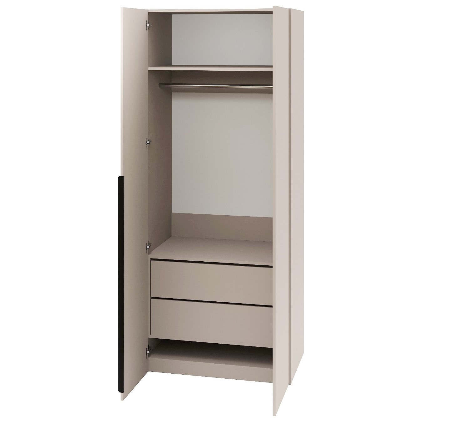 Внутри шкафа расположены вместительный ящик с двумя отделениями, штанга, верхняя и нижняя полки.