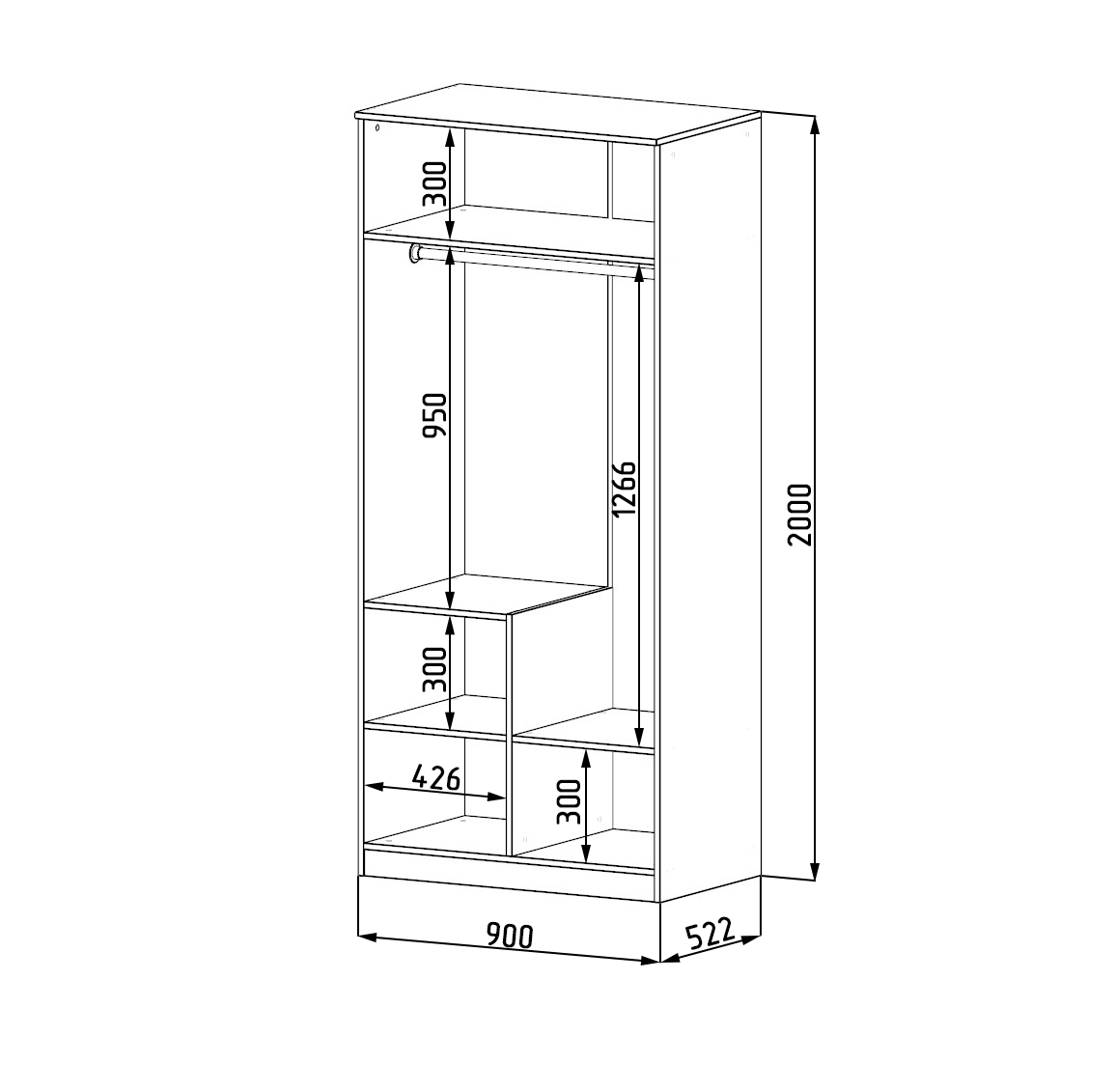 Габариты шкафа: ширина 900, высота 2000, глубина 543 мм