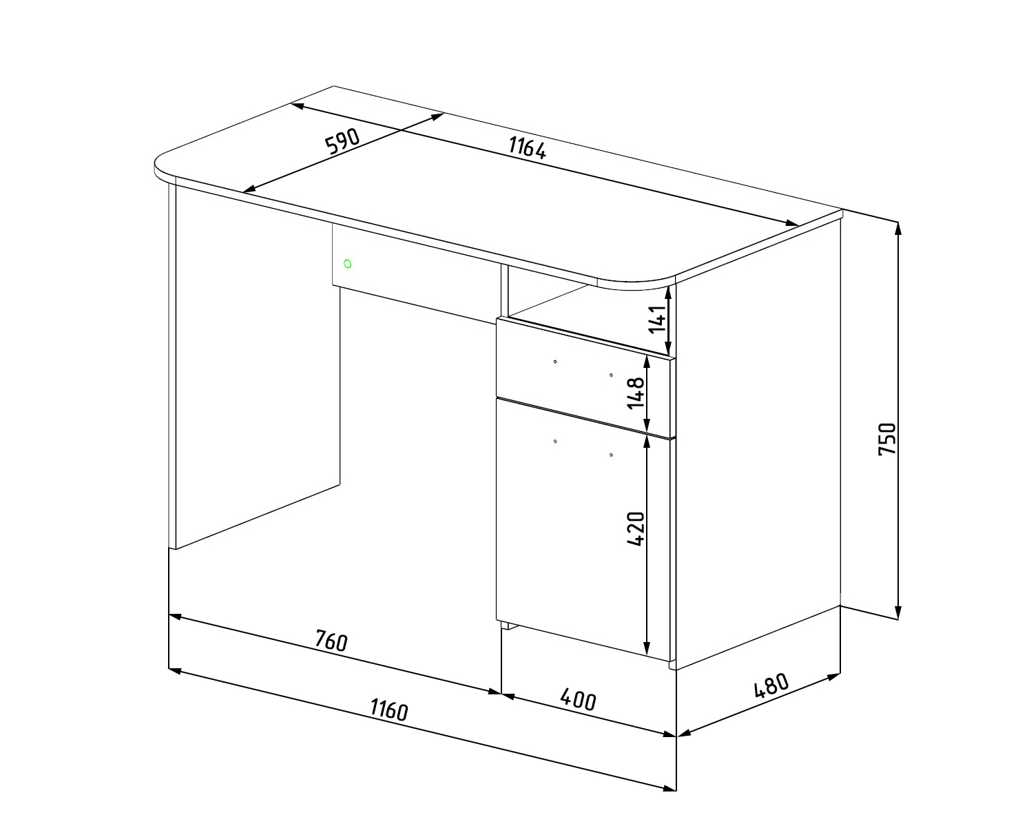 Габариты стола: ширина 1164 х высота 750 х глубина 590 мм