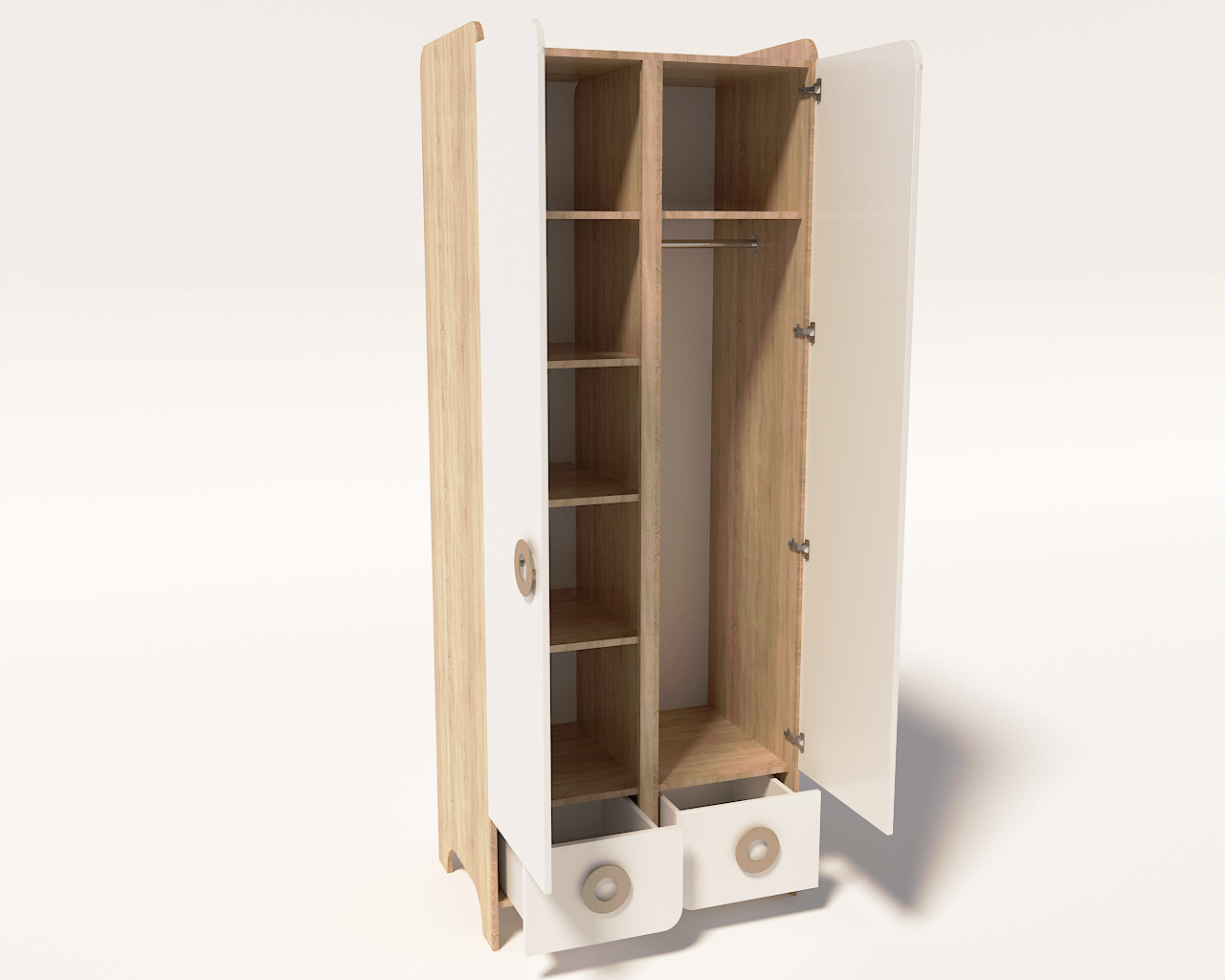 Внутри шкафа имеются штанга, боковые и верхние полки.