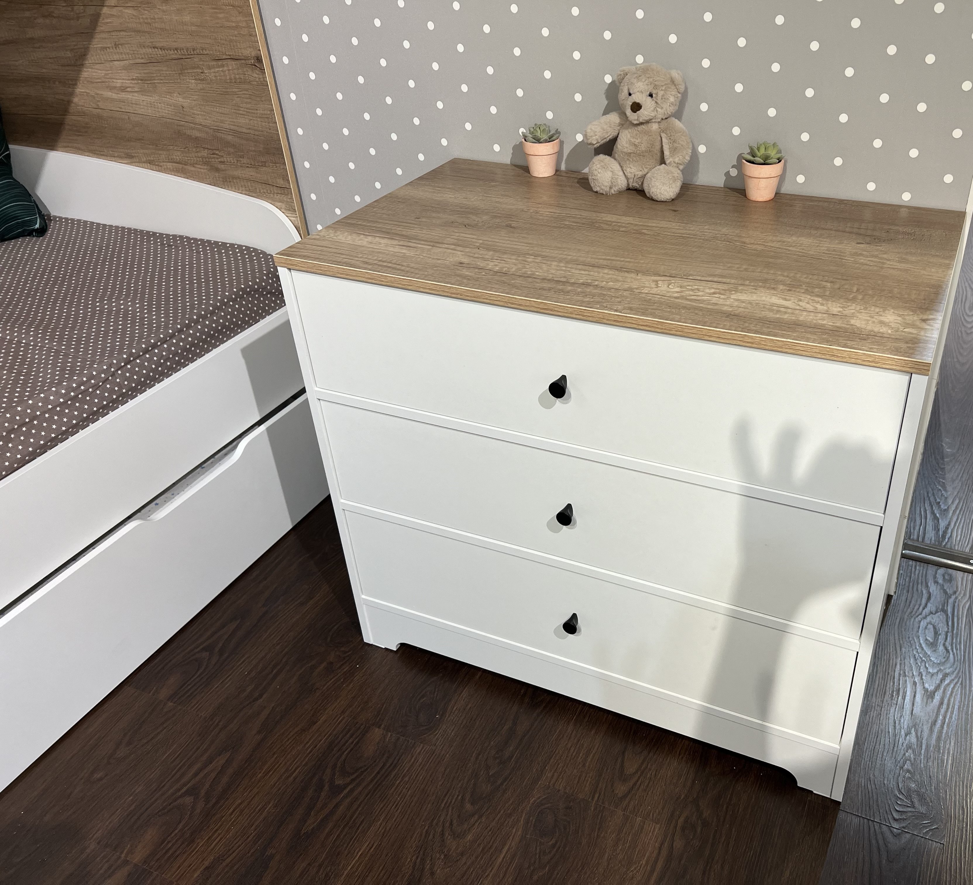В комод встроены три выдвижных ящика на направляющих скрытого монтажа с ДОВОДЧИКАМИ.