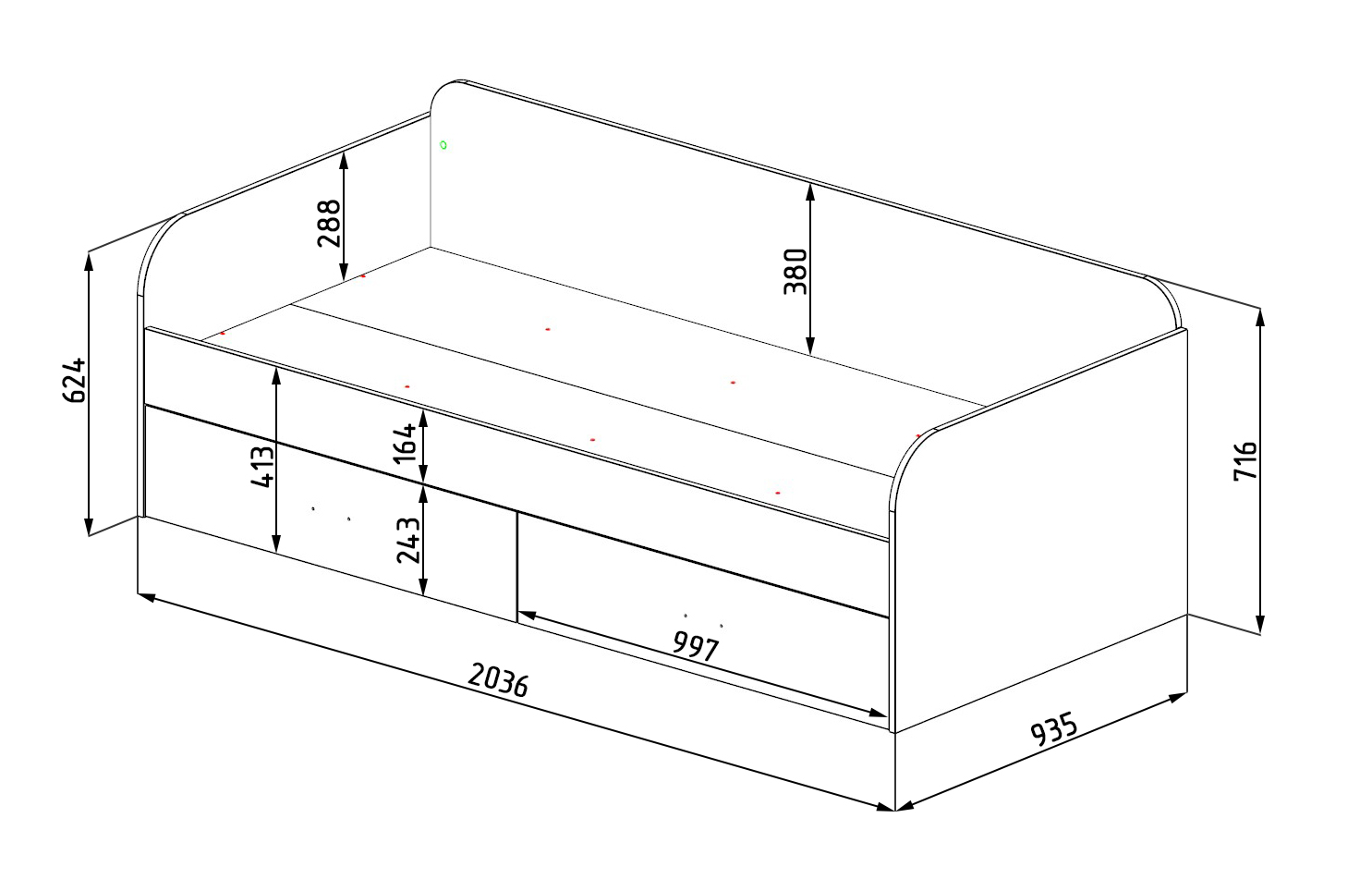 Габариты кровати: ширина 2036 х глубина 935 х высота 716 мм