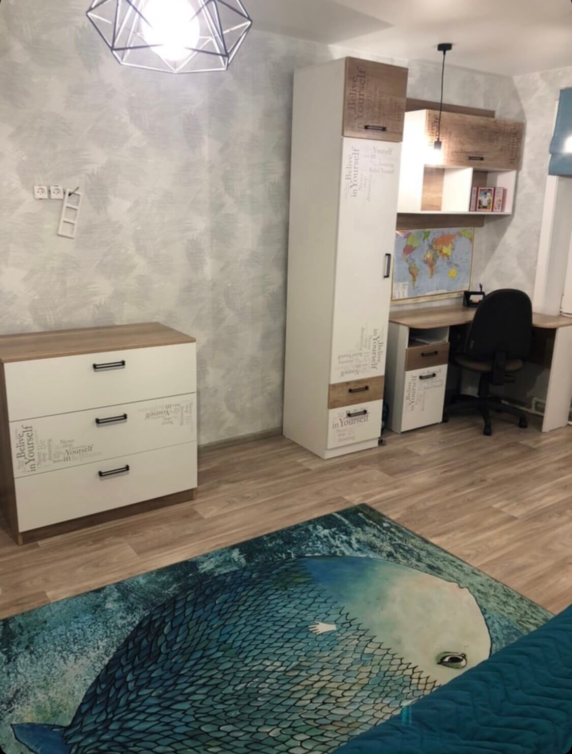 Мебель выполнена из сертифицированного, качественного, экологически чистого ЛДСП класса Е0,5 в сочетании цветов дуб каньон с белым и оформлена дизайнерским принтом.