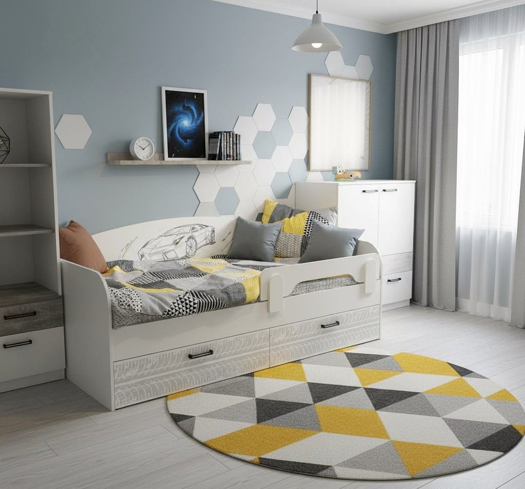 Кровать в современном и стильном дизайне превосходно дополнит интерьер детской комнаты.