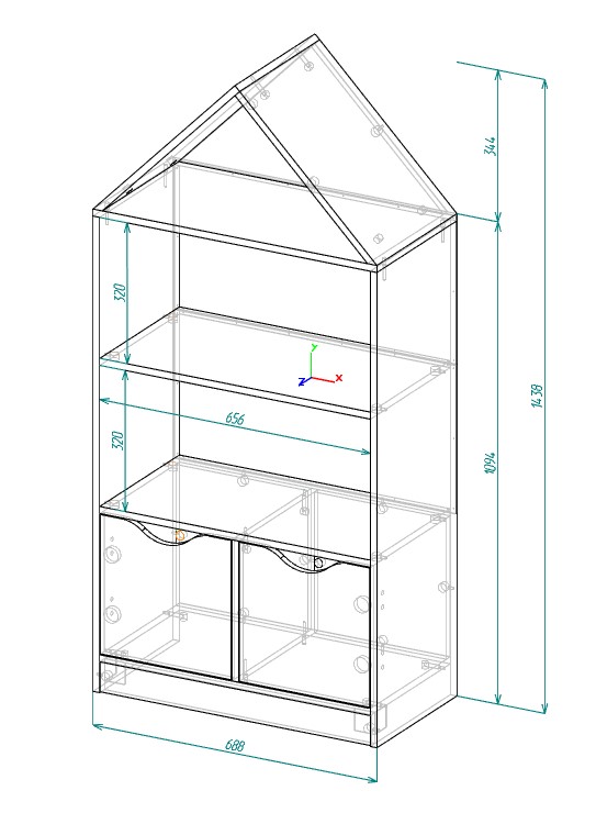 Габариты стеллажа: высота 1438, глубина 350, ширина 688 мм
