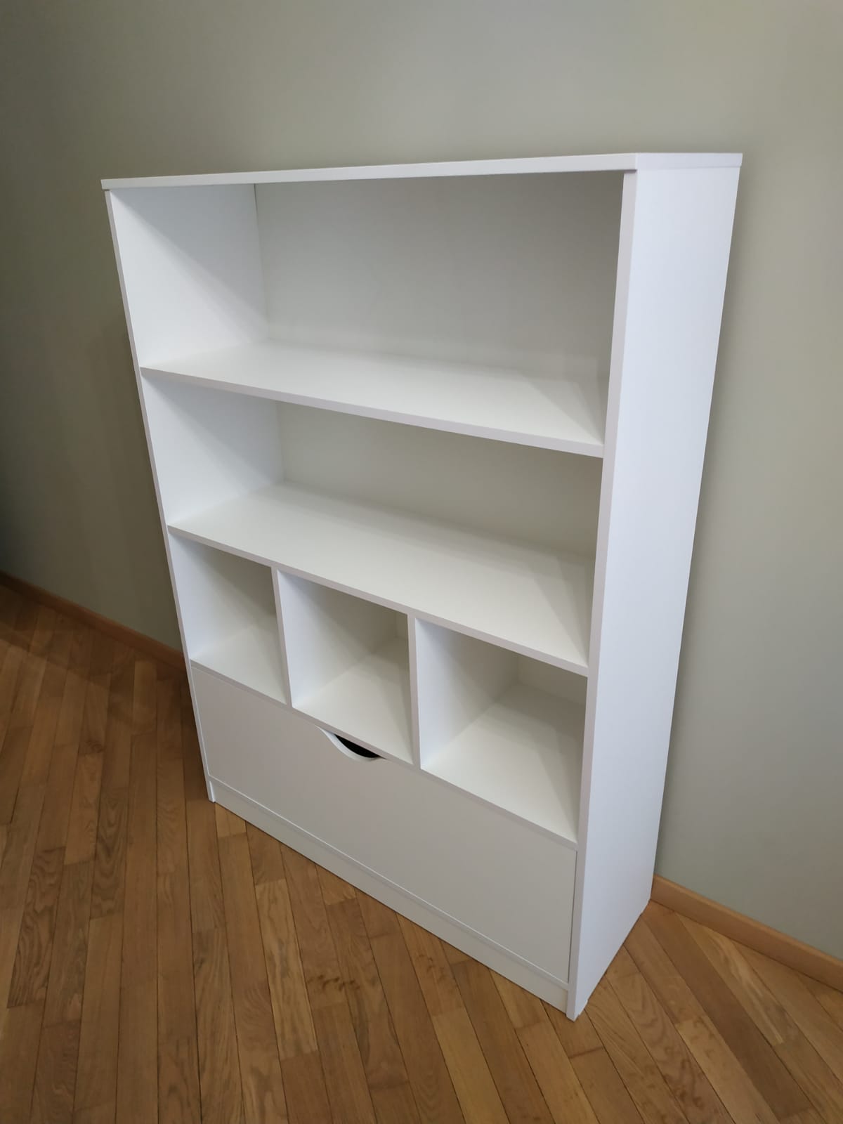 Дверка стеллажа открывается вниз.