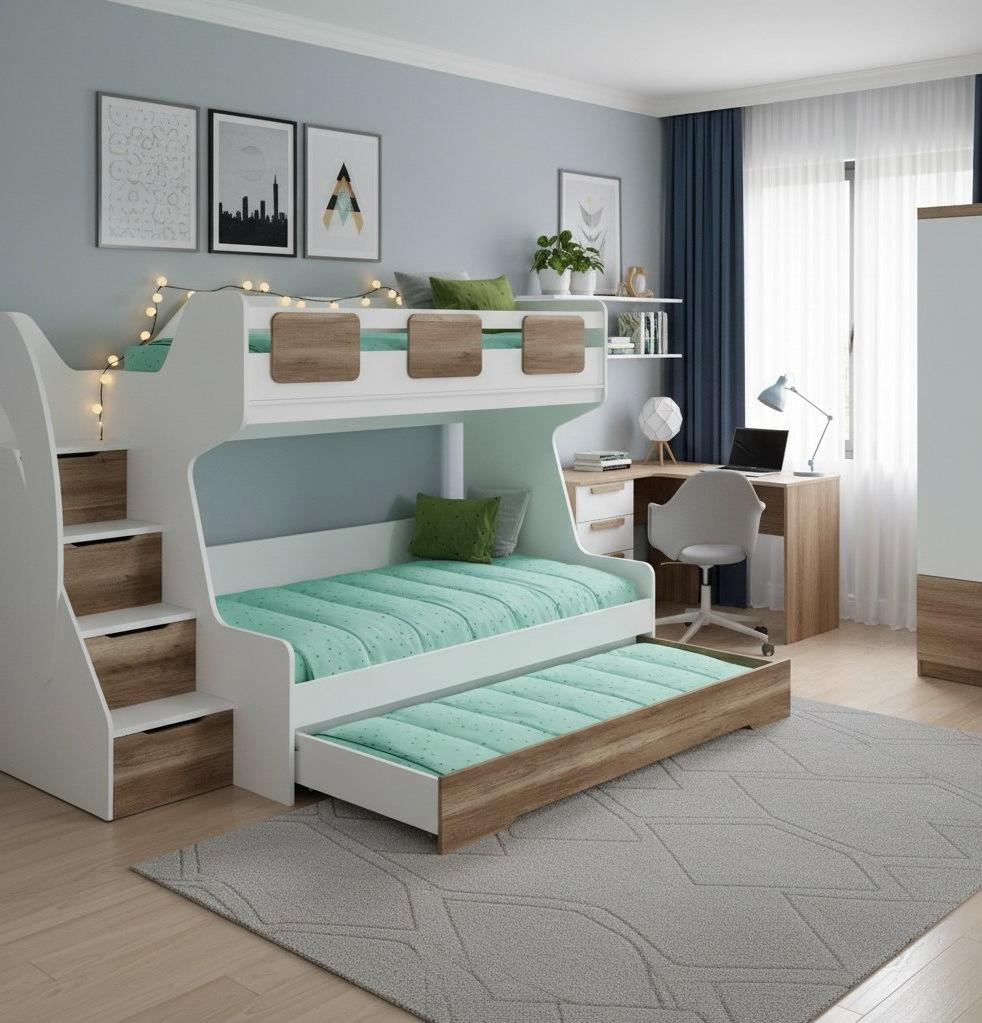 Увеличенное, просторное нижнее спальное место позволяет комфортно разместиться ребенку вместе со взрослым.
